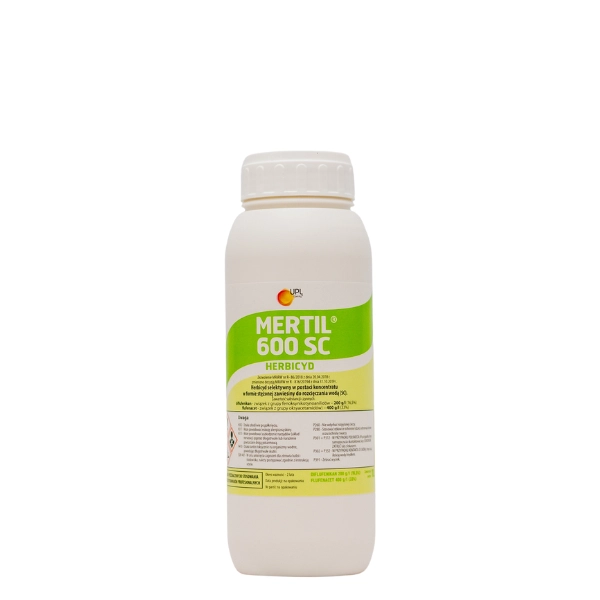 Mertil 600 SC - Herbicyd selektywny, stosowany doglebowo lub nalistnie, występujący w postaci koncentratu w formie