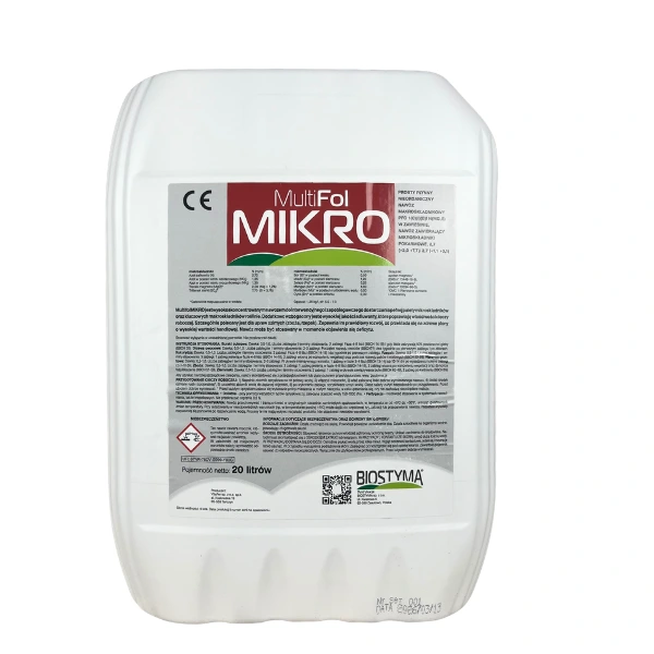 MultiFol MIKRO w pojemności 20 l to płynny nawóz kompleksowany kwasami humusowymi, dedykowany profesjonalnym producentom rolnym i ogrodniczym prowadzącym intensywne zabiegi dolistne na dużych areałach. Duże opakowanie eliminuje konieczność częstego uzupełniania zapasów podczas zabiegów i obniża jednostkowy koszt nawożenia. Stosować wyłącznie na rośliny w fazie aktywnego wzrostu.