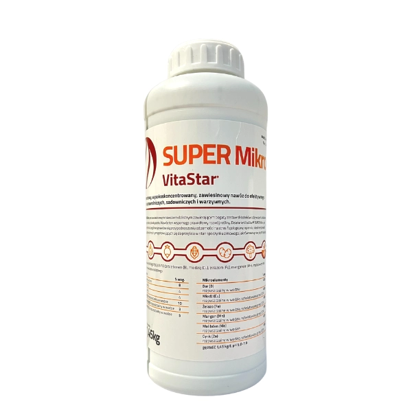 VitaStar SUPER Mikro jest zawiesinowym nawozem dolistnym zawierającym bogaty zestaw makro i mikroelementów, dodatkowo wzbogaconym optymalną dawką azotu. Nawóz ten wspomaga prawidłowy rozwój rośliny. Jego działanie jest wszechstronne, jednak szczególnie sprawdza się przy podnoszeniu odporności na stres fizjologiczny, np mróz. Dlatego idealnie sprawdzi się w przypadku upraw ozimych, przygotowujące do przejścia w stan spoczynku zimowego jak również upraw jarych na wiosnę. Doskonale miesza się z pozostałymi nawozami z rodziny VitaStar.