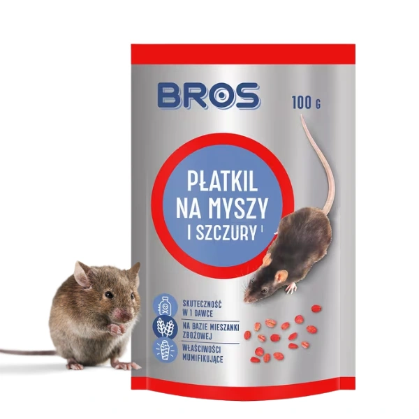 Płatkil - płatki na myszy i szczury Bros 100 g to preparat gryzoniobójczy w kompaktowym opakowaniu doypack, oparty na naturalnej mieszance zbożowej w postaci płatków. Ta forma trutki jest szczególnie atrakcyjna dla gryzoni, zwłaszcza myszy, które chętnie pobierają pokarm w takiej postaci. Produkt jest gotowy do natychmiastowego użycia – nie wymaga żadnych przygotowań ani mieszania. Wystarczy rozłożyć odpowiednią ilość płatków w miejscach występowania szkodników, aby rozpocząć skuteczną deratyzację. Substancją czynną preparatu jest Bromadiolon – skuteczny antykoagulant drugiej generacji zapewniający wysoką efektywność działania. Saszetka doypack to praktyczne rozwiązanie umożliwiające wielokrotne otwieranie i zamykanie opakowania, co zachowuje świeżość płatków i chroni je przed wilgocią przez cały okres użytkowania.