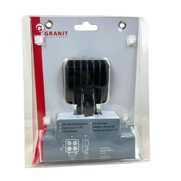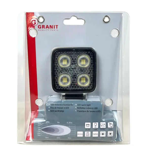 Reflektor roboczy LED GRANIT to kompaktowe oświetlenie dalekosiężne przeznaczone do maszyn rolniczych, pojazdów roboczych i specjalistycznych. Moc 24W z 16 diodami OSRAM zapewnia skuteczność świetlną 1731 lumenów, oferując doskonałą widoczność przy zachowaniu niewielkich rozmiarów. Uniwersalne zasilanie 12/24V z zakresem napięcia 10-30V gwarantuje kompatybilność z różnorodnymi instalacjami elektrycznymi.